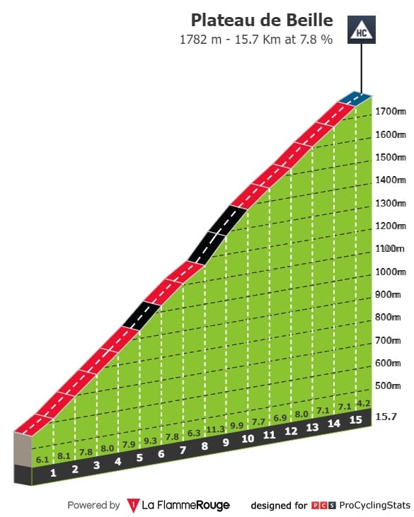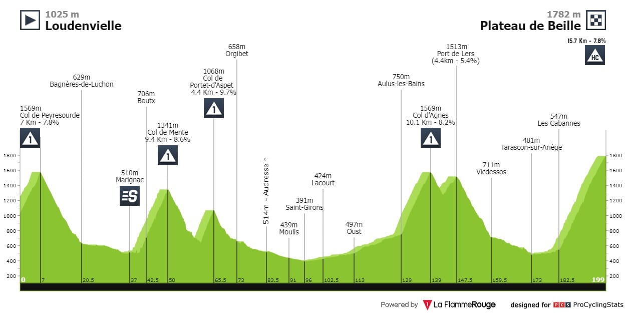 A cerca de 70 quilómetros da meta surge a ascenção ao Col d'Agnes (10.1km @ 8.2%), logo seguida de uma subida não categorizada ao Port de Lers (4.4km @ 5,4%). Os corredores vão aproveitar os 35 quilómetros em descida para se preparem para a derradeira dificuldade: a contagem de categoria especial no Plateau de Beille. São praticamente 16 quilómetros com pendente acima dos 7% e com alguns trechos intermédios a rondar os 10%. O último quilómetros é um falso plano.