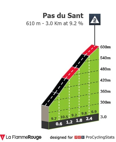 O Pas du Sant parece-me, de facto, um ponto chave na tirada. Se alguns bons trepadores estiverem escapados, a coisa pode ficar feia para homens como Van der Poel, Van Aert, etc. Estou a pensar em homens como Grégoire, Laurance, Aranburu, Velasco, homens desse perfil — com capacidade para pendentes exigentes e com boa capacidade a descer.