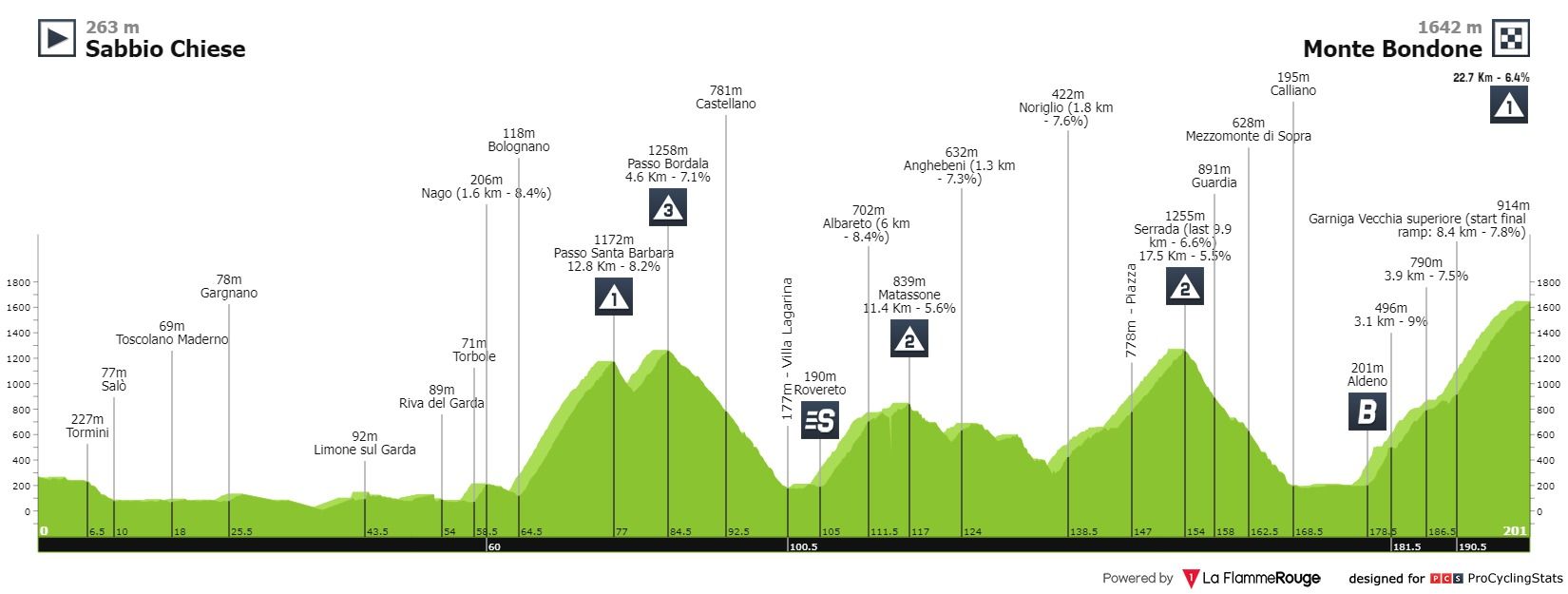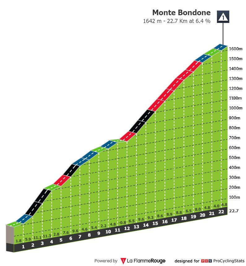 Finalmente chega o interminável Monte Bondone. Mikel Landa venceu aqui em 2014, na última etapa do Giro del Trentino, num dia em que o Tiago Machado chegou na 9ª posição, junto a Fabio Aru. Não é uma subida especialmente dura mas é muito extensa e permitirá fazer diferencias relevantes para aqueles que partirem a corrente.