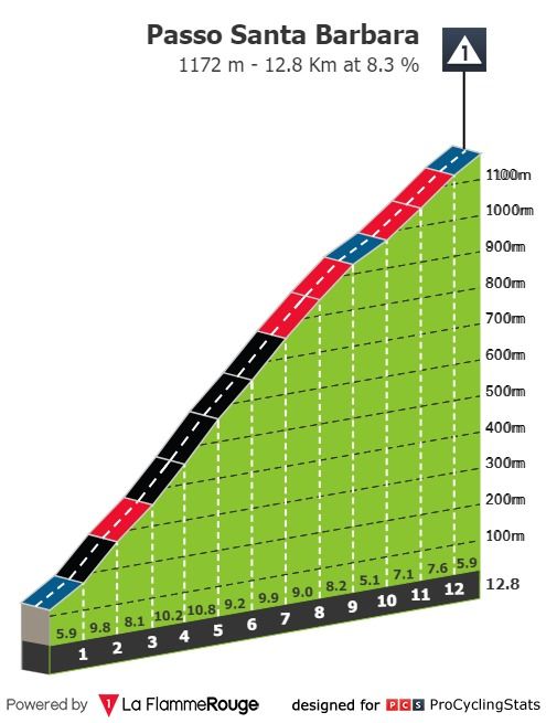 A primeira dificuldade do dia é o Passo Santa Barbara. Prevejo uma luta acérrima pelos candidatos à maglia azzurra enquanto os corredores do top-10 sobem em ritmo de cicloturismo.