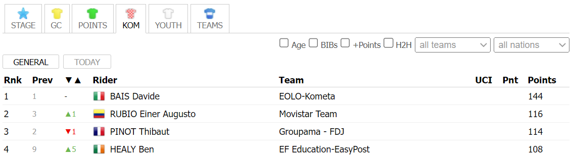 As primeiras três contagens de montanha foram disputadas por Ben Healy e Einer Rubio. A primeira contagem (Valico di Valcava: 1ª cat) foi conquistada pelo irlandês após uma "carga de ombro" bem sucedida: 40-18. Na segunda contagem (Selvino: 2ª cat) Ben Healy voltou a passar primeiro: 18-8. Na terceira (Miragolo San Salvatore: 2ª cat) foi a vez de Einer Rubio passar à frente: 8-18, no photo-finish. Na última contagem (Roncola Alta: 2ª cat) o ciclista da EF chegou primeiro e o colombiano da Movistar foi apenas o 4º a atingir o topo: 18-4. Contas do dia: 84-48, favorável ao irlandês. A luta pela azzurra está ao rubro.