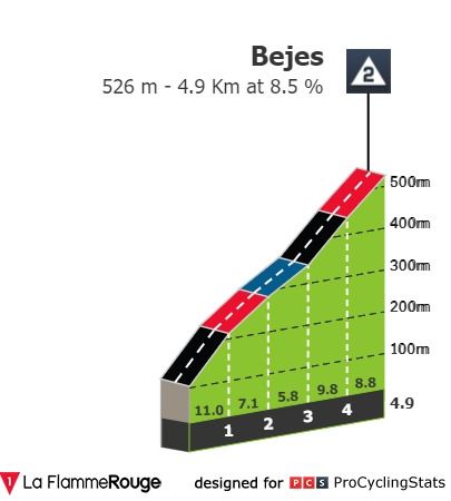 A cerca de 5 quilómetro do final irão ter pela frente a ascenção a Bejes (4.9km - 8.5%), subida que ainda de curta distânica apresenta zonas com 10 e 11% de inclinação.