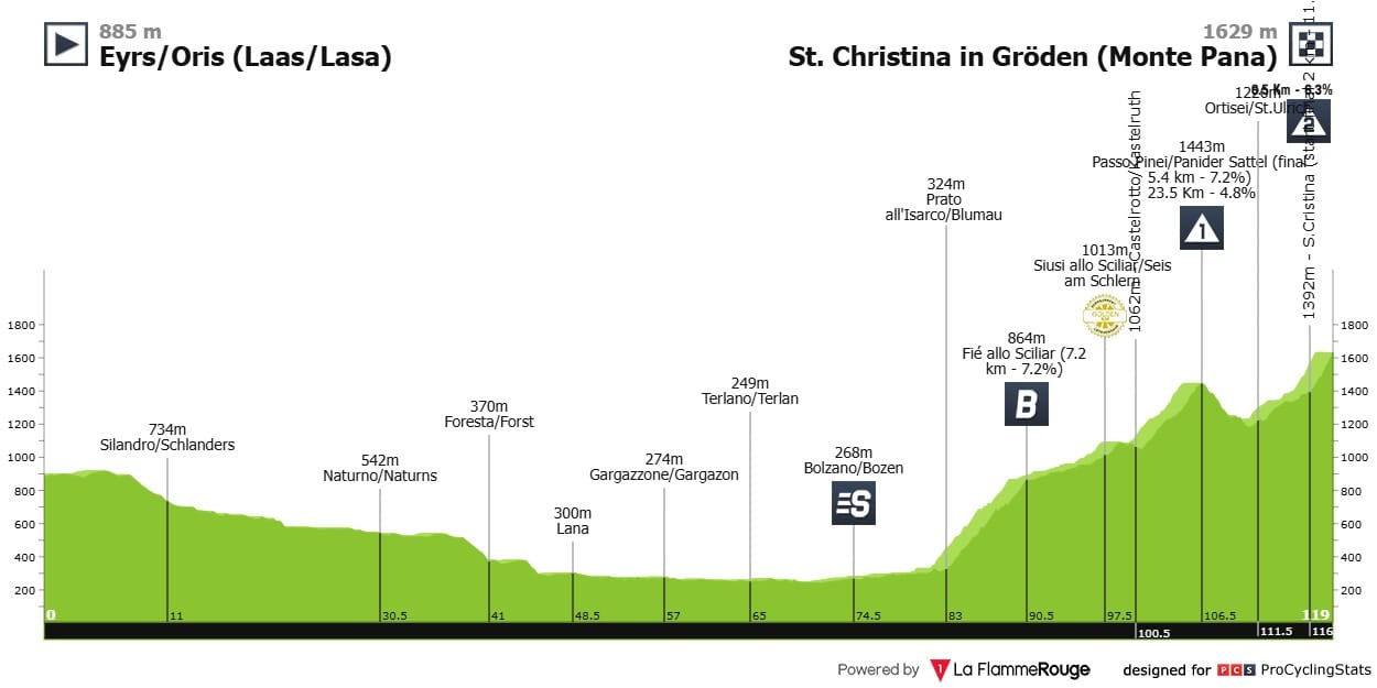 A subida inicial vai doer e quem não tiver tomado o pequeno-almoço pode ficar para trás ainda antes de chegarem ao Passo Sella. Se isso acontecer, vamos ver as equipas da GC a assumir um ritmo forte e a adiar a definição da fuga do dia.