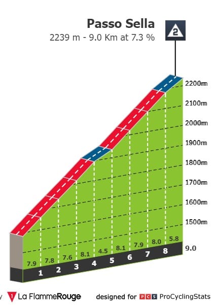 Não aqueçam bem, não. A etapa começa logo a subir, com a ascenção ao Passo Sella. São nove quilómetros onde raramente a pendente baixa dos 7%.