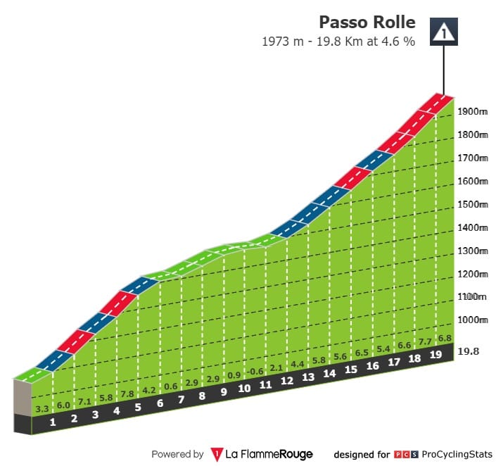 Seguem-se quarenta quilómetros a descer até chegar ao Passo Rolle. Uma subida longa que se divide em duas, com um falso plano no meio. Na fase final, as pernas já vão estar moídas.
