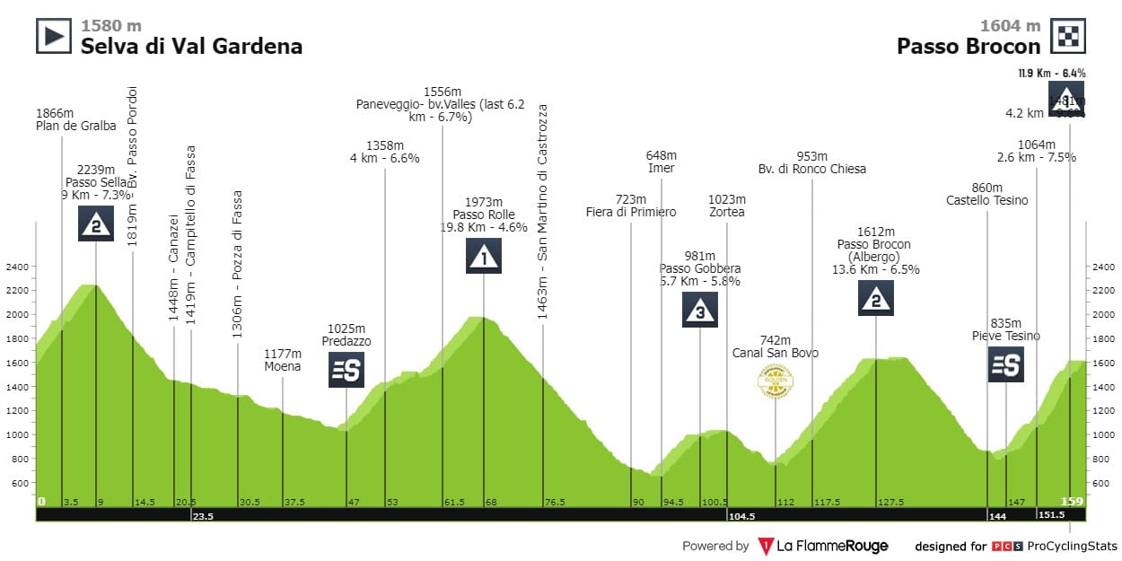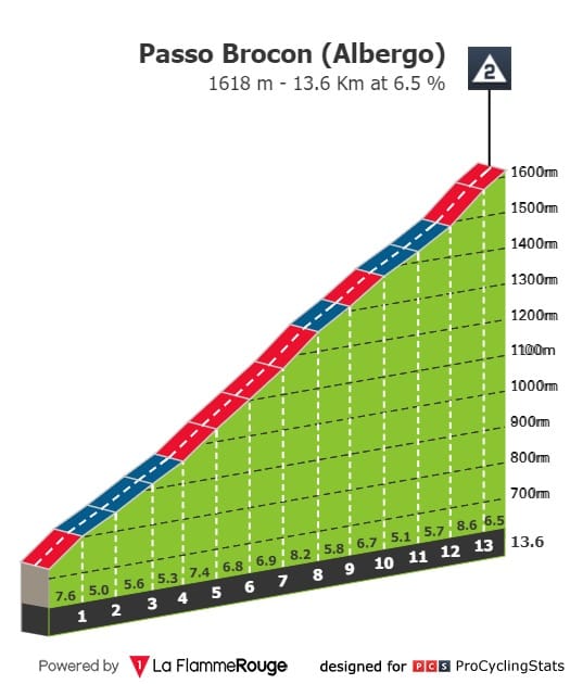 Os corredores vão descer dos 2000 metros até aos 600 metros de altitude, numa descida de praticamente trinta quilómetros até chegar o Passo Gobbera (5.7km @ 6.8%. Finalmente, a cerca de cinquenta quilómetros da meta, começa a primeira de duas subidas ao Passo Brocon.