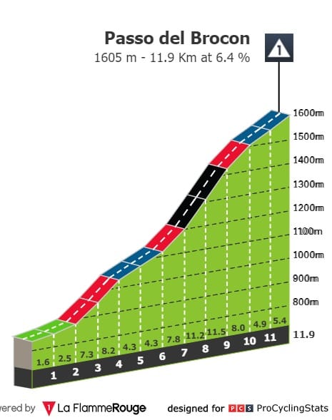 A derradeira subida ao Passo del Brocon tem um trajeto mais curto, mas bem mais duro do que a primeira. A cinco quilómetros da meta têm de percorrer dois quilómetros com pendente média acima dos 11%. Duro.
