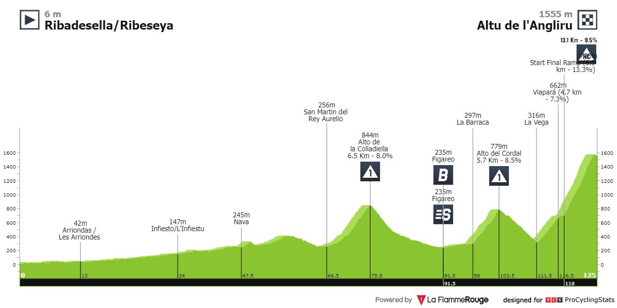 A primeira metade em falso plano e a segunda a partir pernas. A sensivelmente 55 quilómetros da meta começa o sofrimento com o Alto de la Colladella seguido do Alto del Cordal, duas subidas curtas mas com trechos a rondar os 10% de inclinação.