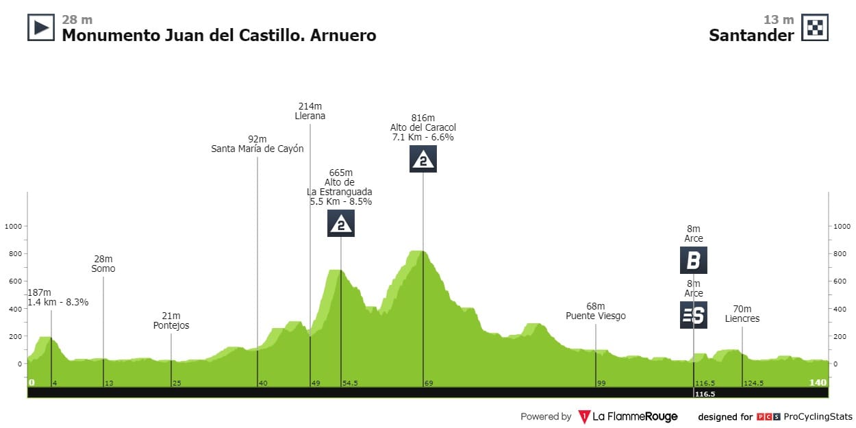 Aos 55 quilómetros, surge o Alto de La Estraguada, uma 2.ª categoria de 5.5 quilómetros em que os dois últimos têm pendente média acima dos 14%. Seguem-se meia dúzia de quilómetros a descer para esticar as pernas antes da última dificuldade relevante do dia, o Alto do Caracol, ainda a 70 quilómetros da meta.