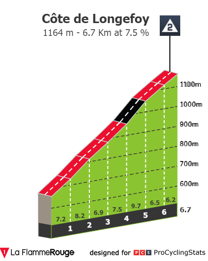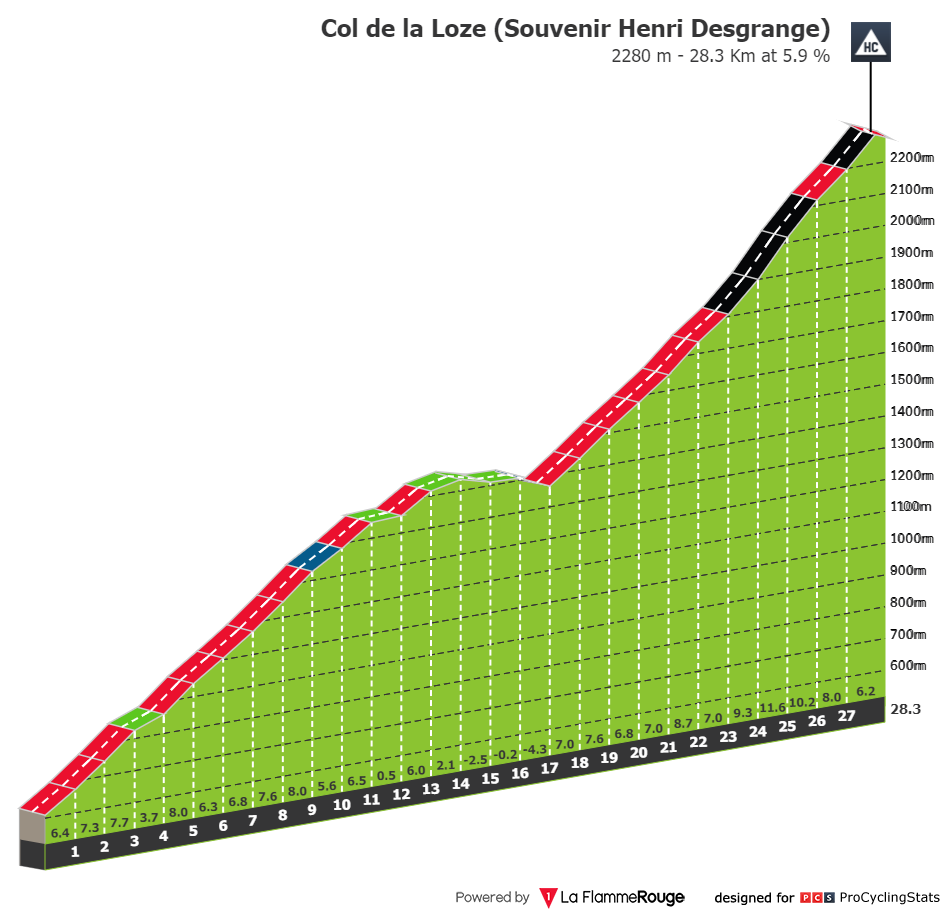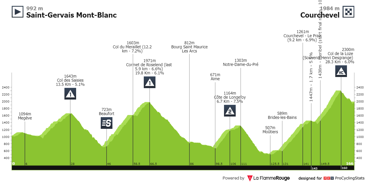 São duas primeiras categorias e uma especial, com uma segunda categoria pelo meio. Das seis ascenções que os ciclistas irão fazer, quatro delas serão todas acima dos 1500 metros de altitude, inclusive uma delas com 2300 metros. Col de la Loze será a última das subidas e serão 28.3km a 5.9%.