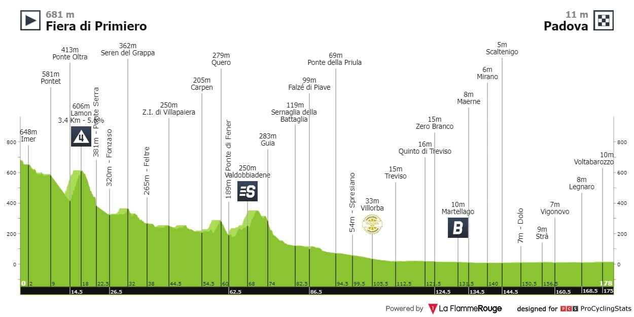 Etapa predominantemente descendente com alguns topos na primeira metade do percurso. Os últimos 65 quilómetros, entre Treviso e Padova, são completamente planos.