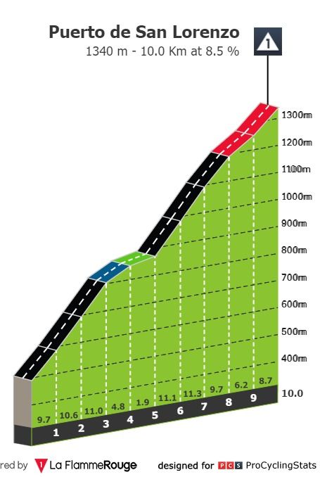 A primeira grande dificuldade do dia surge ainda na primeira metade do percurso. O Puerto de San Lorenzo tem 10 quilómetros de extensão e metade deles são feitos acima de 10% de pendente média.