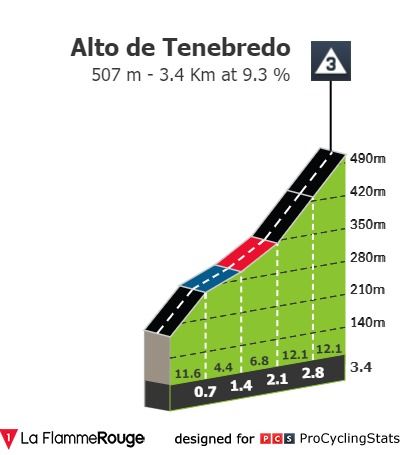 A mais de 50 quilómetros do fim surge ainda o Alto de Tenebredo, uma subida curta mas muito dura. O último quilómetro tem uma inclinação superior a 12%.