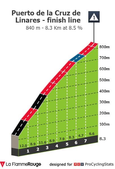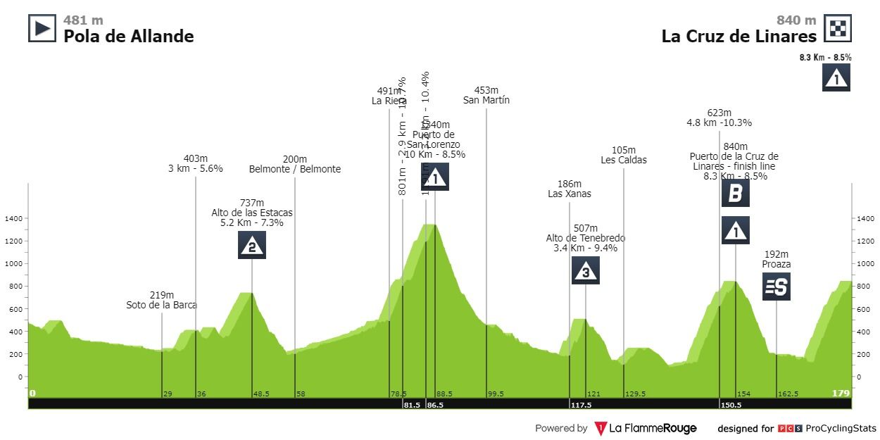 Mais uma etapa duríssima e com mais quilometragem do que as últimas. Não há Tourmalet nem Angliru mas o acumulado é imenso. Ao todo são 5 subidas categorizadas, 3 de 1.ª categoria.