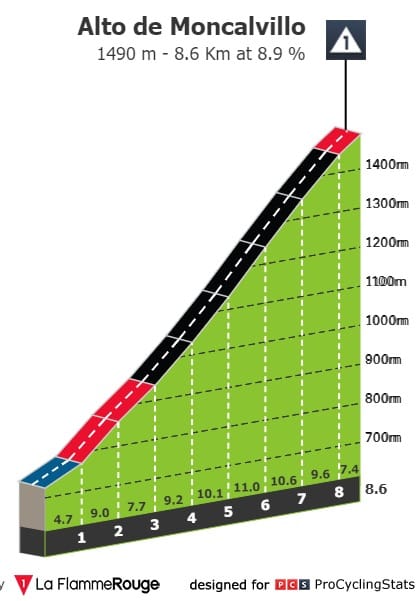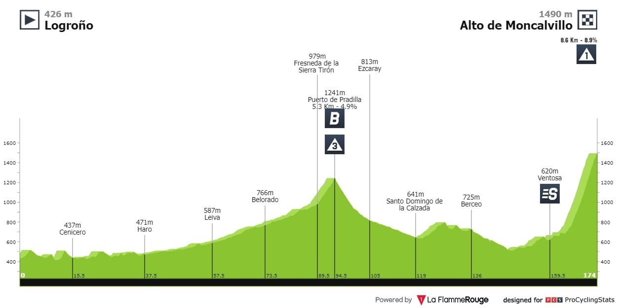 Depois da passagem pelo Puerto de Pradilla (5.3km-4.9%), o pelotão segue em direção até ao momento do dia, a subida ao Alto de Moncalvillo (8.6km-8.9%). Com pendentes intermédias acima dos 10%, termina a praticamente 1500 metros de altitude.