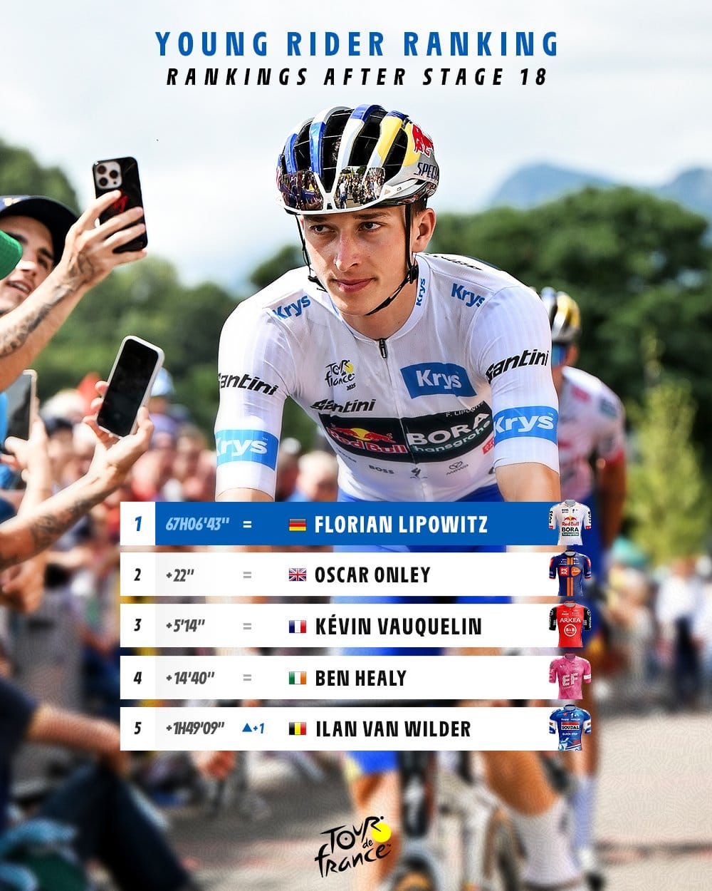 Oscar Onley, Florian Lipowitz e Primož Roglič — A luta pelo pódio.