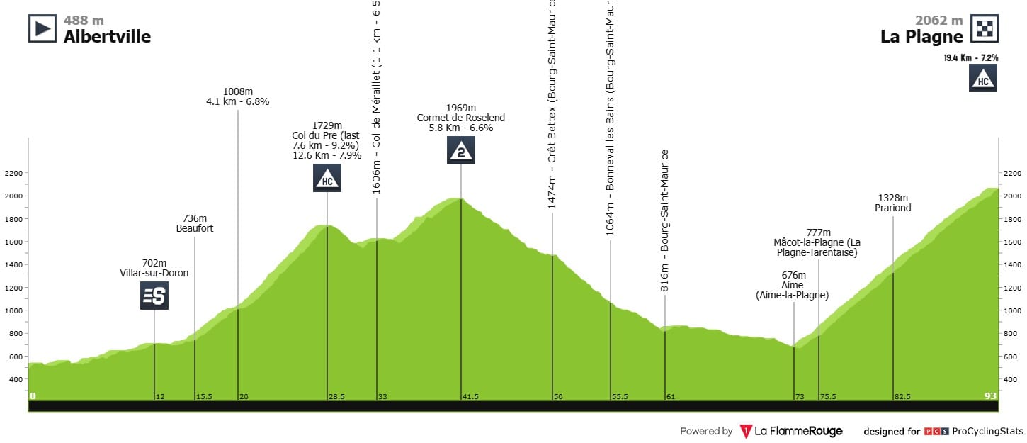 Ou seja, passamos a ter duas subidas de categoria especial, o Col du Pre e La Plagne e pelo meio uma segunda categoria, Cormet de Roselend. O Col du Pre com menos quilometragem, mas com pendentes mais elevadas, principalmente no seu final, onde chegam perto dos doze por cento, e La Plagne bem mais longa, serão um pouco mais de dezanove quilómetros de subida.