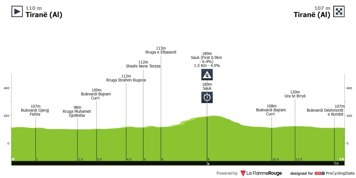 São quase 14 quilómetros de contrarrelógio plano na capital albanesa com uma lomba explosiva (1500m @ 4.9%, com os primeiros 900m a 6.4%) pelo meio, que não prejudica significativamente os especialistas nem beneficia substancialmente os trepadores.