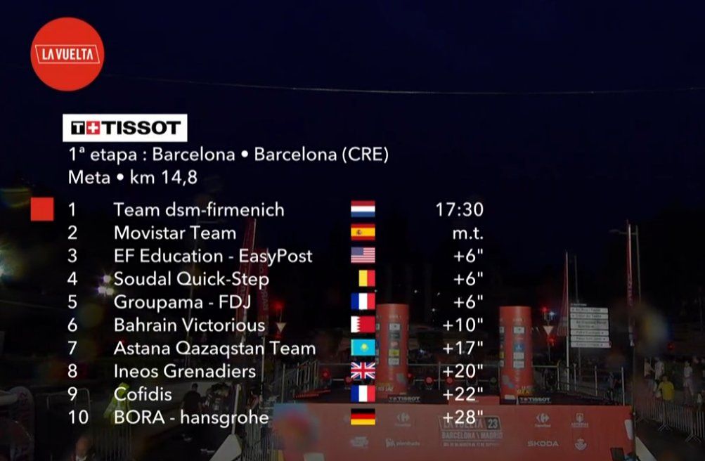 A começar pela equipa vencedora, a DSM e roja para Lorenzo Milesi. Outra das grandes surpresas foi a perda de tempo (35 segundos) por parte da equipa da Jumbo-Visma, devido a um furo de Jonas Vingegaard. E, como isto ainda podia piorar, a UAE perdeu nem mais, nem menos do que 37 segundos e João Almeida ainda teve um problema mecânico, mas algo de bom foi ter sido no último quilómetro e ficou com o mesmo tempo da equipa.