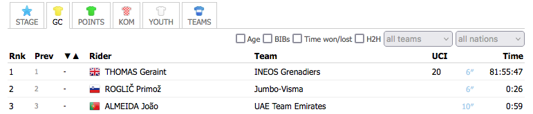 Do lado de quem adora ciclismo, isto não podia estar pior. Pouca acção entre os homens que lutam pela geral. Também verdade seja dita que esta etapa foi das mais duras dos últimos anos em grandes voltas e fiquei claramente com a ideia que a maioria já está toda com a corda na garganta. Inclusive, o nosso João Almeida. Roglič atacou, Thomas foi na roda e o João lá foi aos solavancos até chegar novamente a eles. Eis que em seguida o senhor de 36 anos decide mostrar quem manda e o João ficou, até Roglič teve dificuldades num primeiro momento, embora no final tenha passado à frente do britânico como que dizendo "estou confiante, estou confiante".