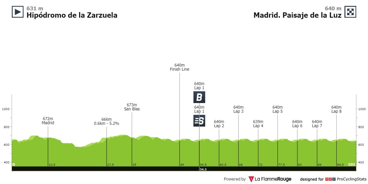 Cinquenta quilómetros levam ao circuito madrileno, onde se vão realizar seis voltas. É um circuito perto de plano e onde o sprint parece inevitável.