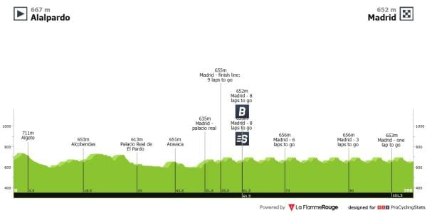 Etapa de consagração do campeão da Vuelta. Uma etapa para o sprint com o final em Madrid. Os último 60 quilômetros são feitos num circuito dentro da cidade.