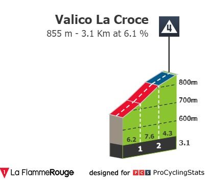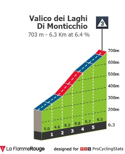 São duas subidas consecutivas — Valico dei Laghi di Monticchio (6.3kms a 6.4%) e Valico La Croce (3.1kms a 6.1%) — com uma dificuldade reduzida mas que, precisamente por se sucederem com apenas uma ligeira descida entre si, podem trazer problemas aos homens mais rápidos. A descida de La Croce pode também ser um ponto de tensão no que ao resultado final diz respeito. A chegada à meta é depois feita num terreno sobe-e-desce que não parece muito provável para perseguir eventuais escapados.