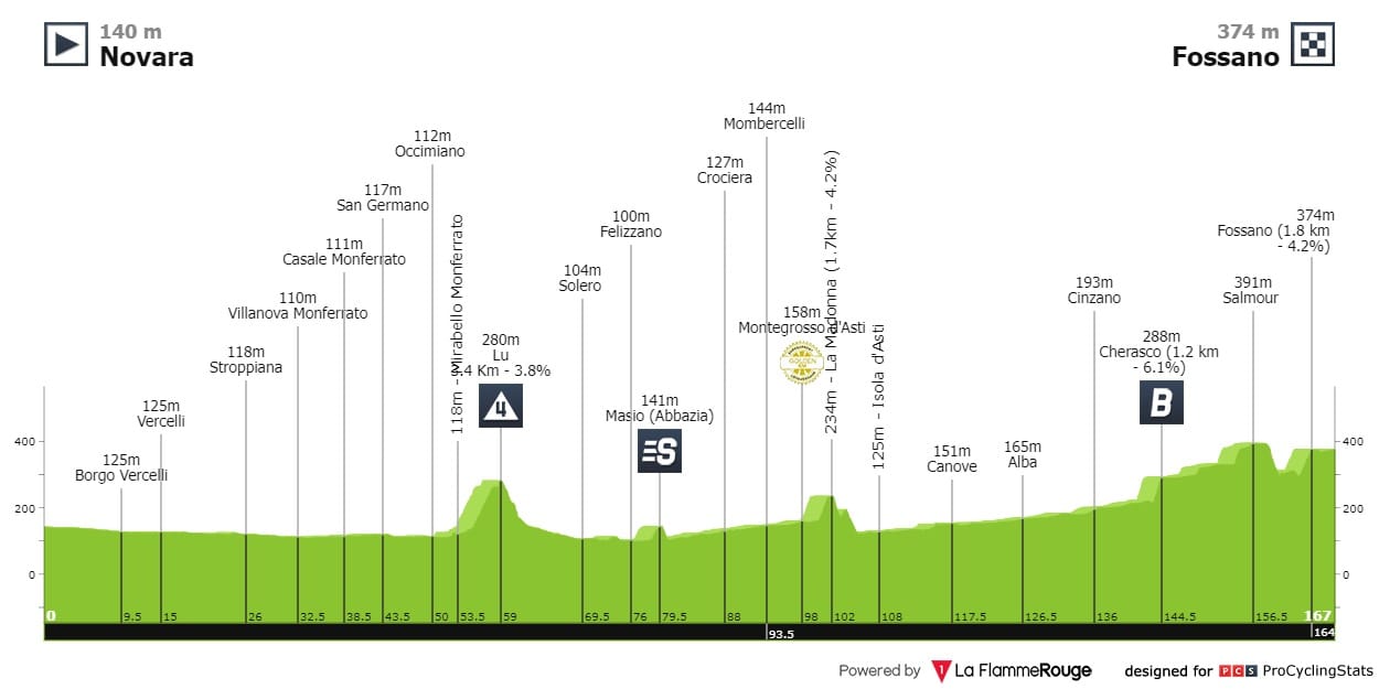 São 166 quilómetros entre Novara e Fossano, num percurso praticamente plano que conta com uma quarta categoria ainda dentro dos primeiros 50 quilómetros, a ascensão a Lu (3.4km a 3.8%). Fora isso, a chegada a Fossano será talvez a parte mais traiçoeira com um pequeno topo de 1.8 quilómetros a 4.2%, que irá deixar os corredores a 3 quilómetros da meta.