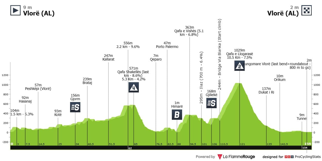 Com a partida e chegada em Vlorë o pelotão terá aqui um — podemos-lhe chamar — "pequeno teste". Depois da passagem por Qafa Shakelles (5.3@4.2%) cujo o útlimo quilómetro tem 8.6%, o desafio do dia será o Qafa e Llogarasë, ou, Passo de Llogara (10.5km@7.5%) que irá deixar os ciclistas a trinta quilómetros da meta, sendo os últimos vinte em plano.Serão cento e sessenta quilómetros para o pelotão poder zerpar da Albânia e romar a Itália.