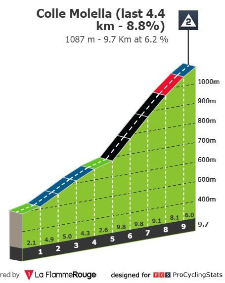 Parece pouco. Mas os ciclistas nestas subidas vão andar sempre acima dos 1000 metros de altitude e eis que chegamos ao Colle Molella, em que destaco os últimos 4.4 quilómetros com pendentes a chegarem perto dos 10%. Segunda categoria? Está certo. Isto promete.