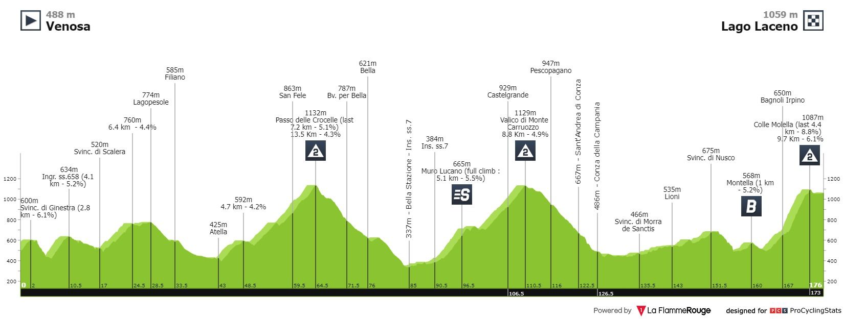 E eis que ao quarto dia de prova poderemos começar a perceber quem está bem de pernas. Chegou a primeira etapa de montanha. Três segundas categorias pode ser considerado uma etapa de montanha? Com estas pendentes, pode. Ao quilómetro 49 os ciclista irão começar a subir o Passo delle Crocelle, cerca de 14 quilómetros a 4.3%. Passados 40 quilómetros começarão por subir o Muro Lucano, 5.1 quilómetros a 5.5%, e depois sem descerem, sobem o Valico di Monte Carruozzo, 8.8 quilómetros 4.9%.
