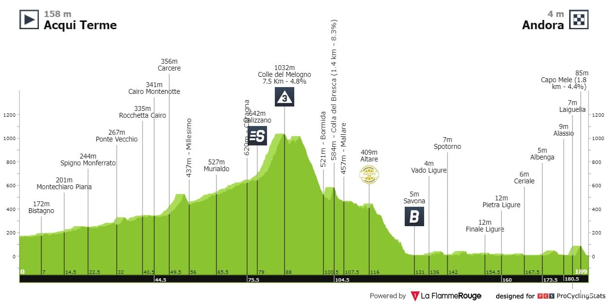 São 190 quilómetros desde as fontes de enxofre de Acqui Terme até Andora (não Andorra). Primeiro os corredores irão ter um sprint intermédio em Calzzano, depois a única dificuldade do dia irá aparecer quando ainda faltarem mais de 100 quilómetros para o final e trata-se de uma única subida, o Colle del Melogno (7.5km @ 4.8%). Segue-se o sprint intergiro em Altare e daí descem para a costa de Savona onde terão o último sprint intermédio. De Savona a Andora espera-se uma corrida rápida ao longo da costa italiana.