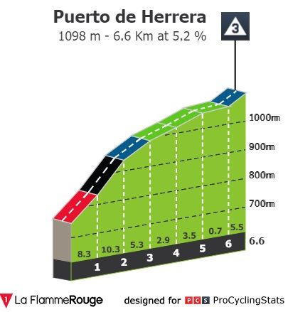 O destaque da etapa é sem dúvida a 3ª categoria em Puerto de Herrera. São 6.6 quilómetros a 5.2% de pendente média, com o final a 1098 metros de altitude. A média não assusta quem não viu o perfil com atenção: os primeiros três quilómetros têm perto de 8% de inclinação média, incluíndo uma secção plana.