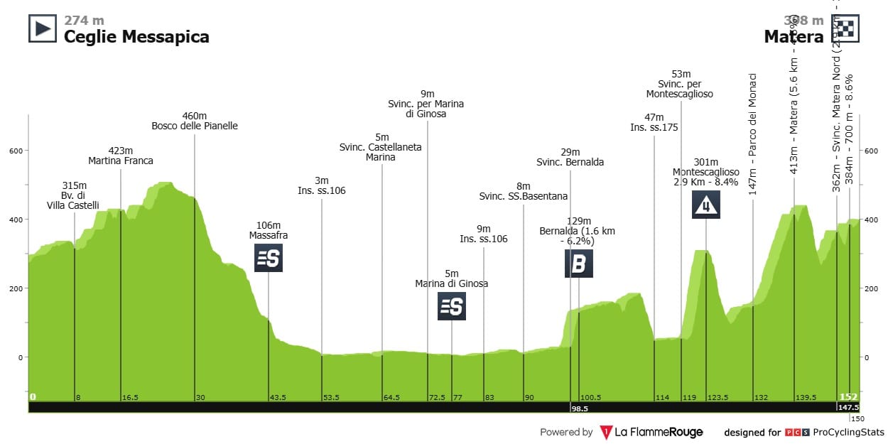 A animação aparece nos últimos cinquenta quilómetros com um sobe e desce onde há a destacar a subida de Montescaglioso. Uma quarta categoria de quase três quilómetros com pendentes a chegarem aos onze por cento.