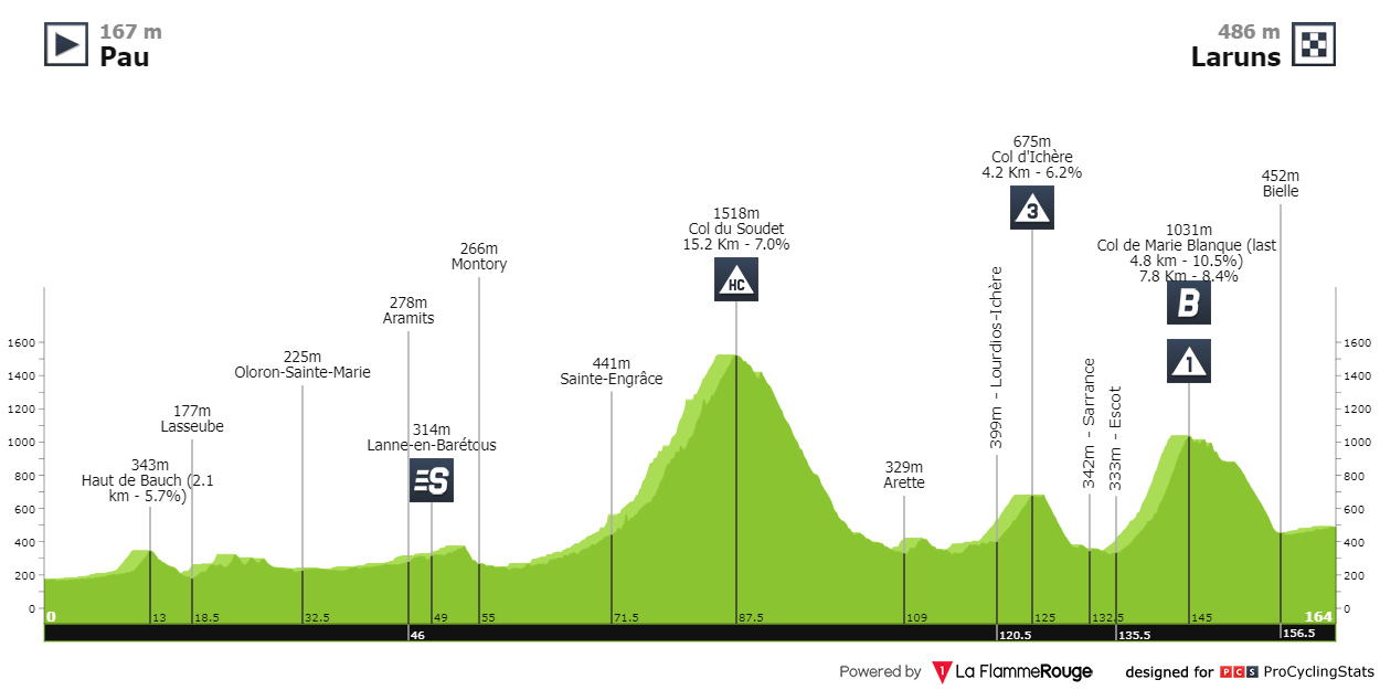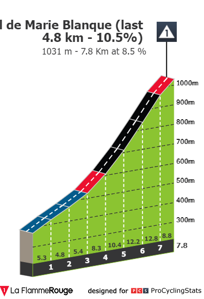 O perfil em teoria até poderia apontar para uma fuga forte, e já há muitos ciclistas competentes longes o suficiente na geral, mas vendo aquilo que tem sido a postura da UAE penso que quererão que a vitória fique no grupo dos favoritos, perseguindo durante todo o dia, endurecendo a primeira das contagens de montanha e lançando o ataque de Pogačar no Col de Marie Blanche.