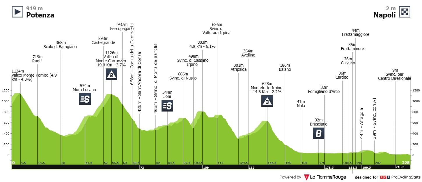 Sobe-e-desce constante durante dois terços da tirada (sou só eu, ou cada vez que digo, leio ou escrevo "tirada" incorro no pensamento: os sinónimos de "etapa" estão a escassear), com uma segunda e uma terceira categorias pelo caminho, bem como várias subidas não categorizadas. A partir de Nola, a coisa de 60 quilómetros da meta, temos finalmente terreno plano e aí o pelotão entra em rota urbana, passando inúmeras localidades até entrar em autoestrada antes do acesso a Nápoles (pizza com guanciale e mozzarella de búfala?). Os últimos três quilómetros tem uma ligeira ascensão em empedrado, já dentro de Nápoles, mas nada de preocupante. A recta da meta faz-se com 900 metros em asfalto em boas condições e estrada larga: 9 metros. A chegada é na Via Francesco Caracciolo, uma espécie de marginal, junto ao mar, numa daquelas paisagens que o Giro sempre faz questão de nos oferecer. Perfeito.