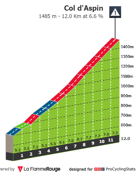 O aquecimento para o Tourmalet começa no Col d'Aspin, uma subida de 12 quilómetros que tem os últimos 6 com médias a rondar os 7 e os 8%.