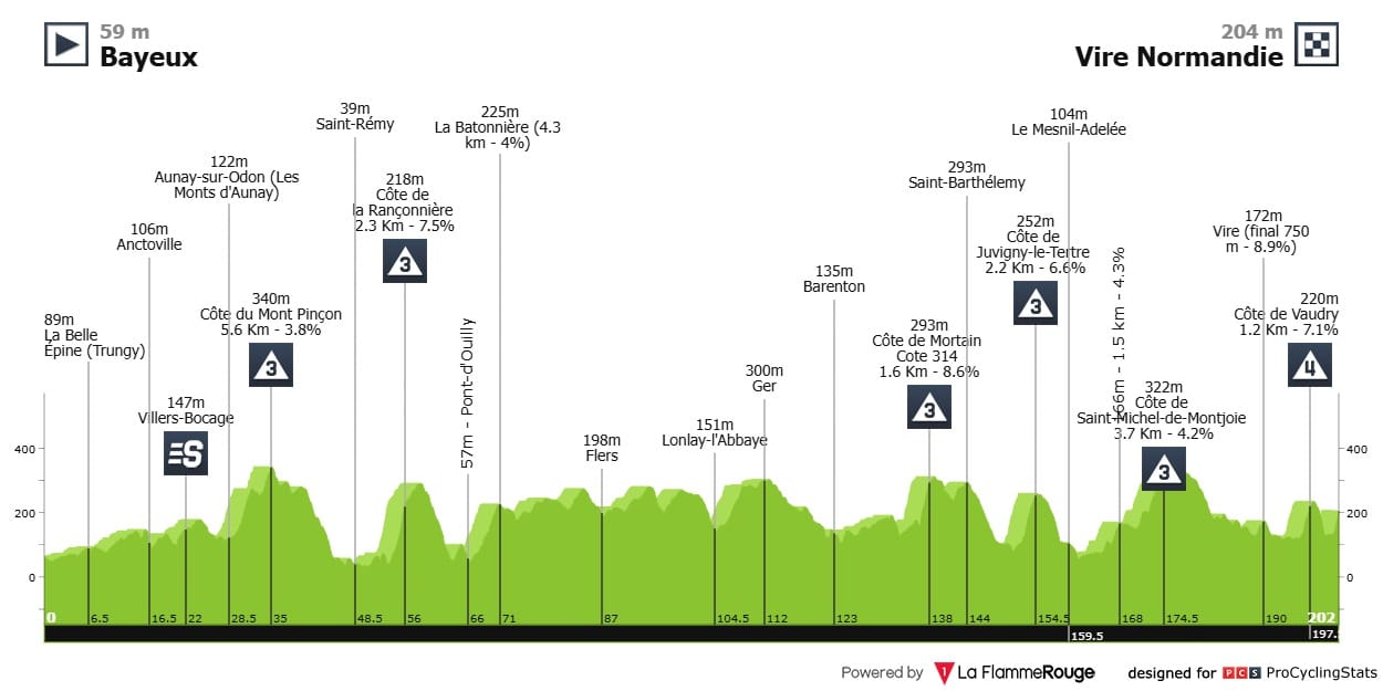 São mais de 200 quilómetros de sobe e desce com a meta empinada. Os destaques deste percurso são o sprint intermédio aos 22 quilómetros e as rampas nos últimos 12 quilómetros — a primeira passagem por Vire (750m @ 8.9%), o Côte de Vaudry (1200m @ 7.1%), já dentro dos últimos 3000 metros, e a finalmente a derradeira subida a Vire (750m @ 8.9%).
