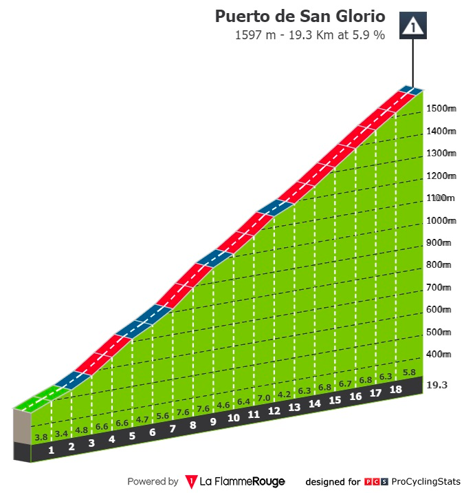 A etapa 7 tem um perfil estranho. Uma primeira categoria no meio da etapa, o Puerto de San Glorio. Uma subida muito longa de quase 20Kms a 5.9%. Sendo o resto da etapa completamente plana. Esta montanha irá afastar os sprinters puros da disputa pela etapa mas será que distancia nomes como Pedersen?