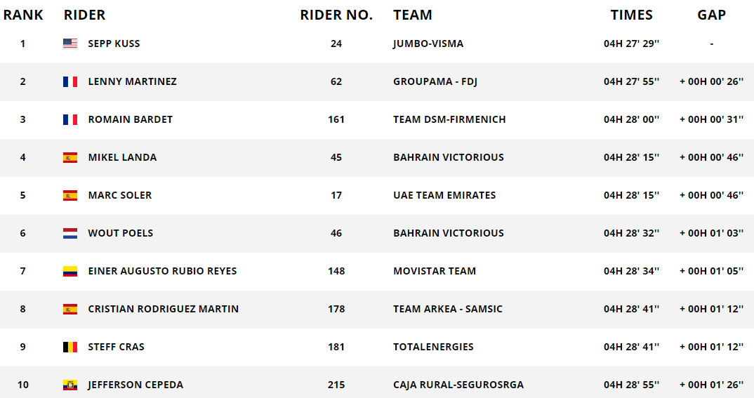 Na subida final há duas histórias para contar, embora se misturem. Rubio abriu as hostilidades no "primeiro pelotão", tendo resposta de Lenny Martinez, Bardet e Kuss. O americano tão rápido como chegou foi-se embora, seguindo isolado para uma merecidissima vitória e mostrando que se houvesse quarta grande volta lá estaria , já que pernas não faltam. O jovem Lenny da FDJ fez segundo, conseguindo manter a distância curta o suficiente para envergar a camisola da liderança. Que duas exibições incríveis.