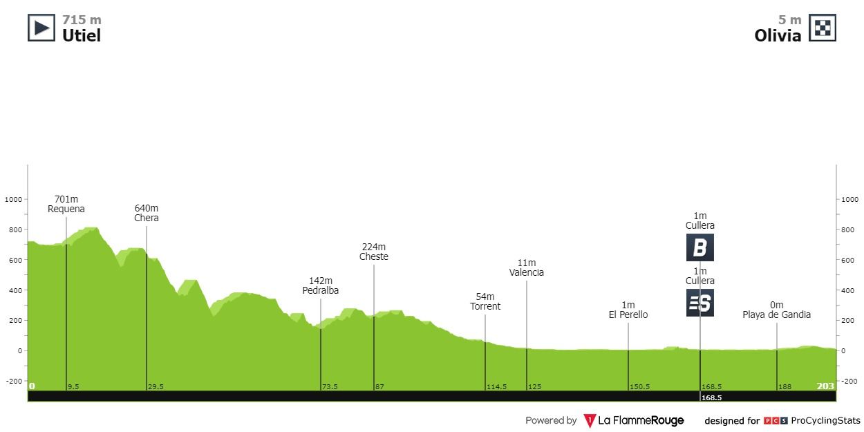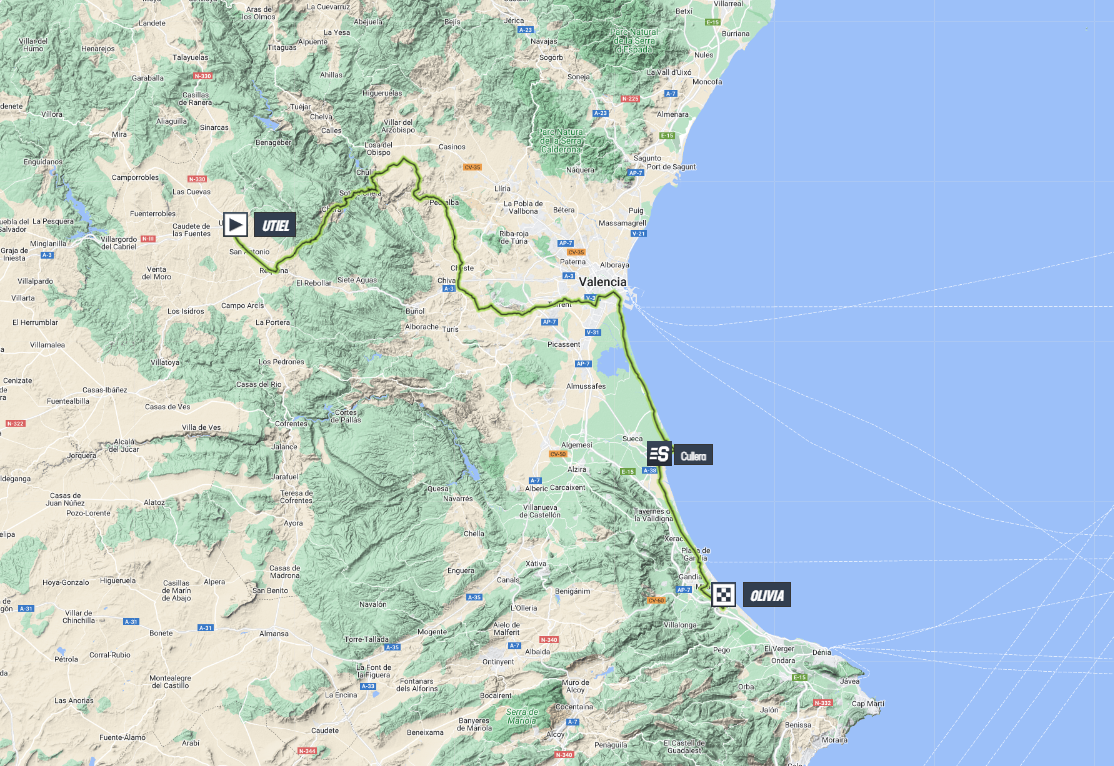 Mas com um olho meio aberto, que os últimos 80 quilómetros serão percorridos na costa valenciana, bem junto ao mar, o que, como bem sabemos, pode resultar nuns belos abanicos. Está previsto vento, nenhuma loucura mas o suficiente para permitir tentativas.