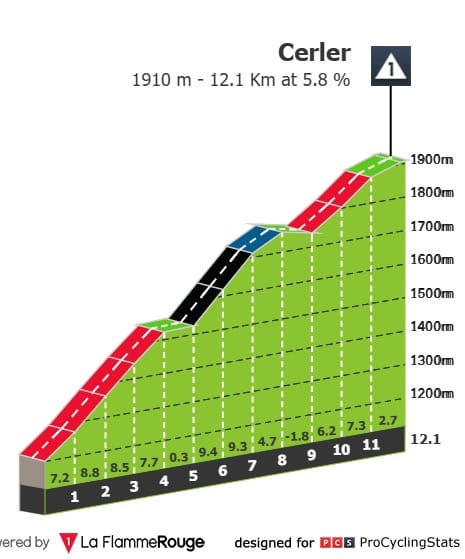 A subida final à estância de ski é dividida em três secções duras que aliviam no final, pelo que a pendente média de 5.8% pode induzir em erro — até a própria extensão indicada não é real, porque o terreno já é inclinado alguns quilómetros antes do sprint intermédio. O último quilómetro da etapa é um gracioso falso plano.