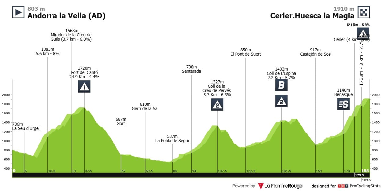 São 188 quilómetros com muita dureza — 4203 metros de acumulado é muita fruta — e com chegada em alto acima dos 1900 metros de altitude. A etapa começa em descida mas não por muito tempo. 13 quilómetros depois do tiro de partida, começa a primeira ascensão do dia, o Port del Cantó (24.9km @ 4.4%), uma subida longa e que vai suavizando — os primeiros 5600 metros têm uma pendente média de 8%.