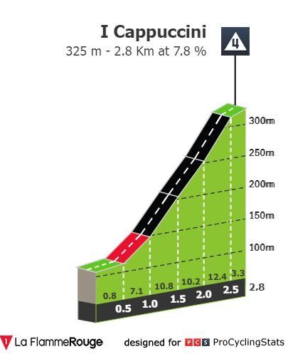 Os corredores irão subir por duas vezes, uma delas a poucos quilómetros da meta, o monte I Cappuccini. Eles que não se lembrem de o beber subida a cima, pois serão quase três quilómetros com percentagens a rondar os 10, 11 e 12%. Queremos festa aqui.