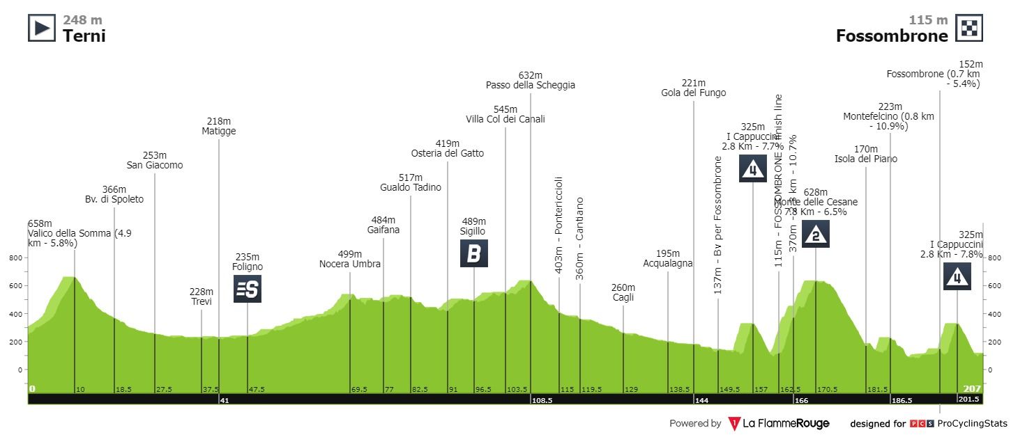 No meio da dupla subida, ainda existe o Monte delle Cesane que ao início tem dois quilómetros entre os 10 e os 11%. E ainda o Montefelcino: 800m a 10,9%.