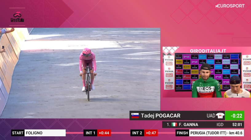 A partir daqui, foi Pogi Show. No segundo intermédio praticamente manteve a diferença para Ganna e na subida final, quando já todos davam o italiano como vencedor da etapa, pulverizou todos os tempos já estabelecidos e venceu com uma margem final de 17 segundos, suficiente para erguer o punho na meta.