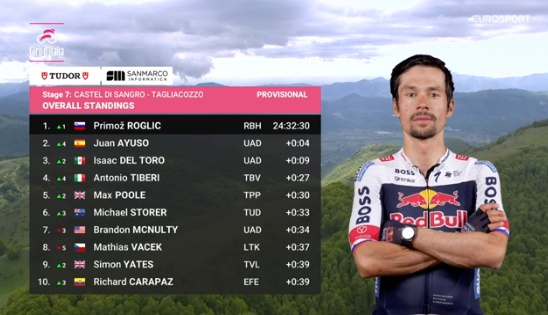 Ao espanhol seguiu-se um super Isaac Del Toro e um incrível Egan Bernal. Primož Roglič ascendeu à primeira posição da geral apesar do dia menos bom, já que à partida era o favorito para esta etapa que no papel tão bem lhe assentava. Ninguém, dos potenciais top-10, perdeu tempo significativo, com 25 ciclistas a chegarem a menos de 1 minuto.