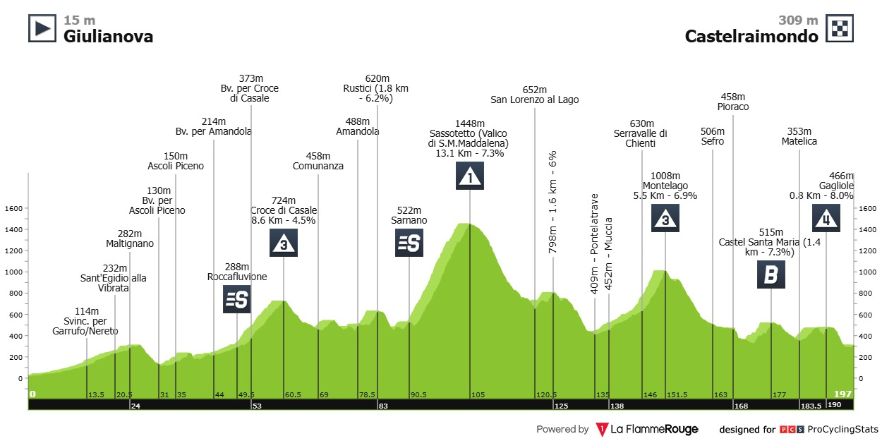 Um inicio de etapa bastante acidentado, sem grandes subidas mas com ainda menos metros planos levam-nos até Sassotetto, que é uma subida bem dura (13km @ 7.3%) mas mal acompanhada pelo que vem a seguir. Há a subida a Montelago (5.5km @ 6.9%) a deixar os ciclistas 50 quilómetros da meta e depois três pequenos topos muito explosivos já nos 20 quilómetros finais. O último dos quais (Gagliole — 0.8km @ 8%) é a meros sete quilómetros da chegada, sendo essa aproximação feita em descida até um quilómetro final em plano.