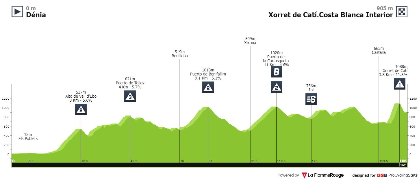 A etapa começa com 15 km de plano a 0 metros de altitude até começarem a subir o Alto de Vall d'Ebo. Depois disso vão oscilar entre os 500 e os 1100 metros de altitude. As três subidas de 2.ª categoria são parecidas: rondam os 10km e os 5% de inclinação média. A última subida, ao Xorret de Catí, é curta mas duríssima.