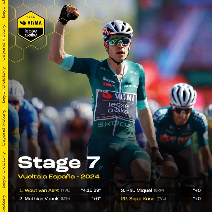 Já perto da meta Marc Soler, David Gaudu e Pavel Sivakov tentaram um de cada vez o seu late attack, mas primeiro Sepp Kuss — que trabalho tremendo, novamente como gregário — e depois Vlasov, sem se perceber bem porquê, permitiram a vitória anunciada de Wout van Aert. Que fácil foi esta segunda glória do ainda mais camisola verde nesta edição da Vuelta.
